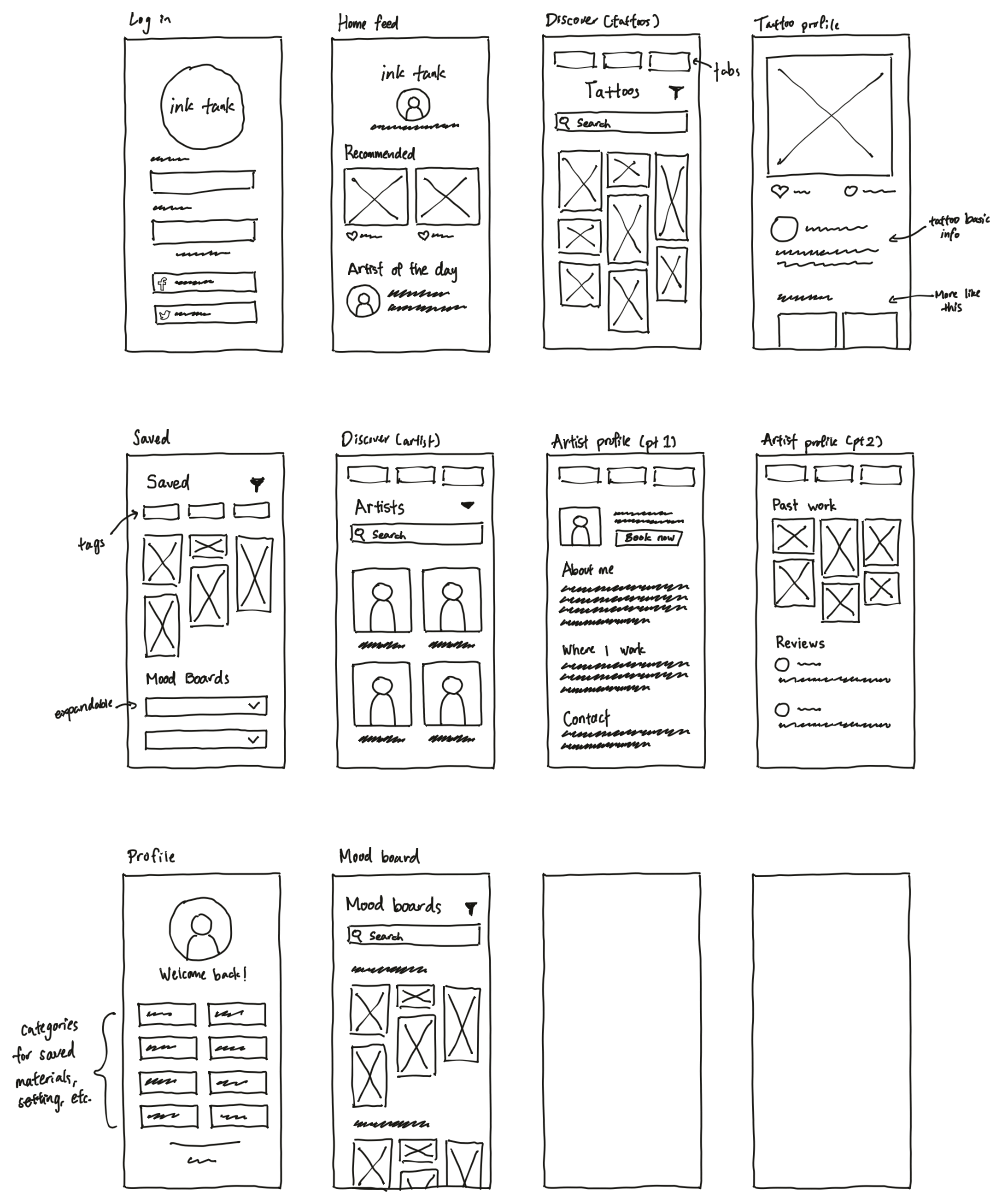 A sitemap was designed to thoroughly identify the structure of Ink Tank and the screens that populate it.
