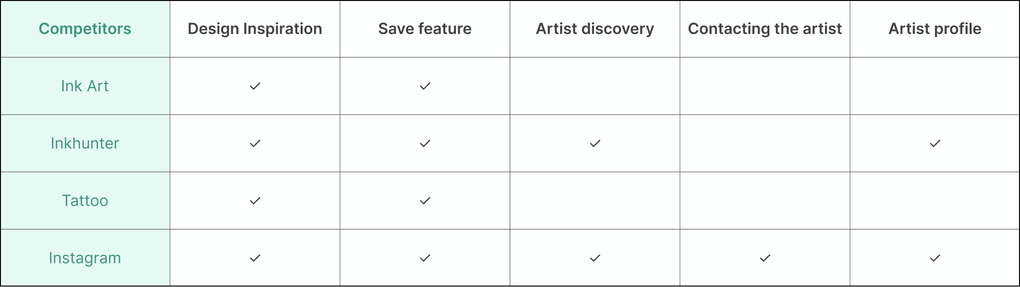 Three directly competing tattoo apps and Instagram were chosen for a competitive analysis to reflect on their strengths and limitations in assisting the user's tattoo journey.