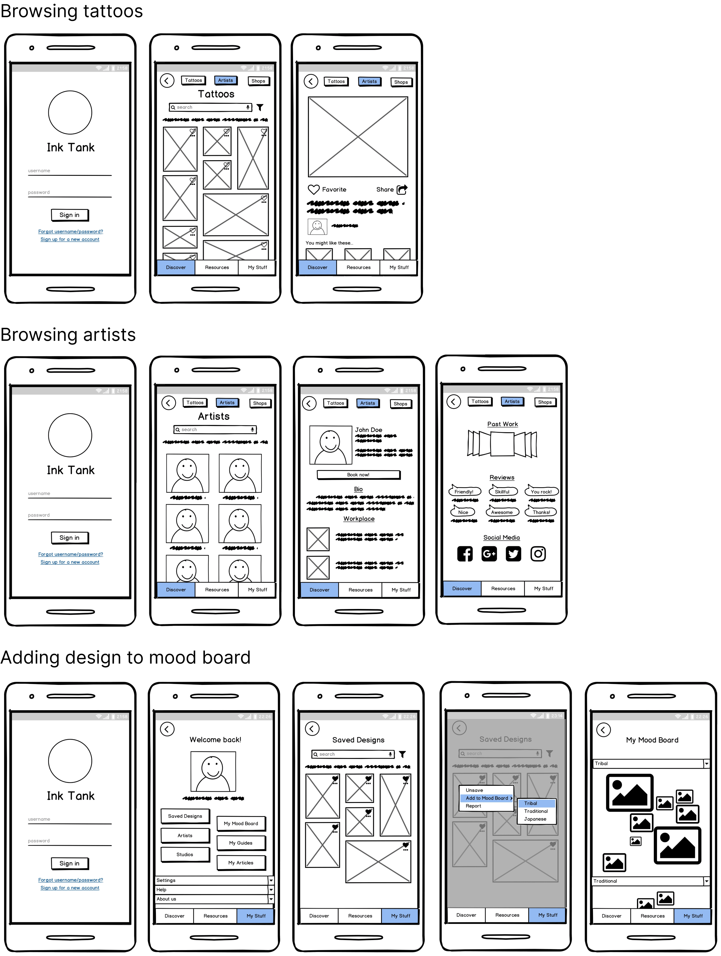 A user flow diagram was created to explore how Alex will approach researching for his next tattoo using Ink Tank.